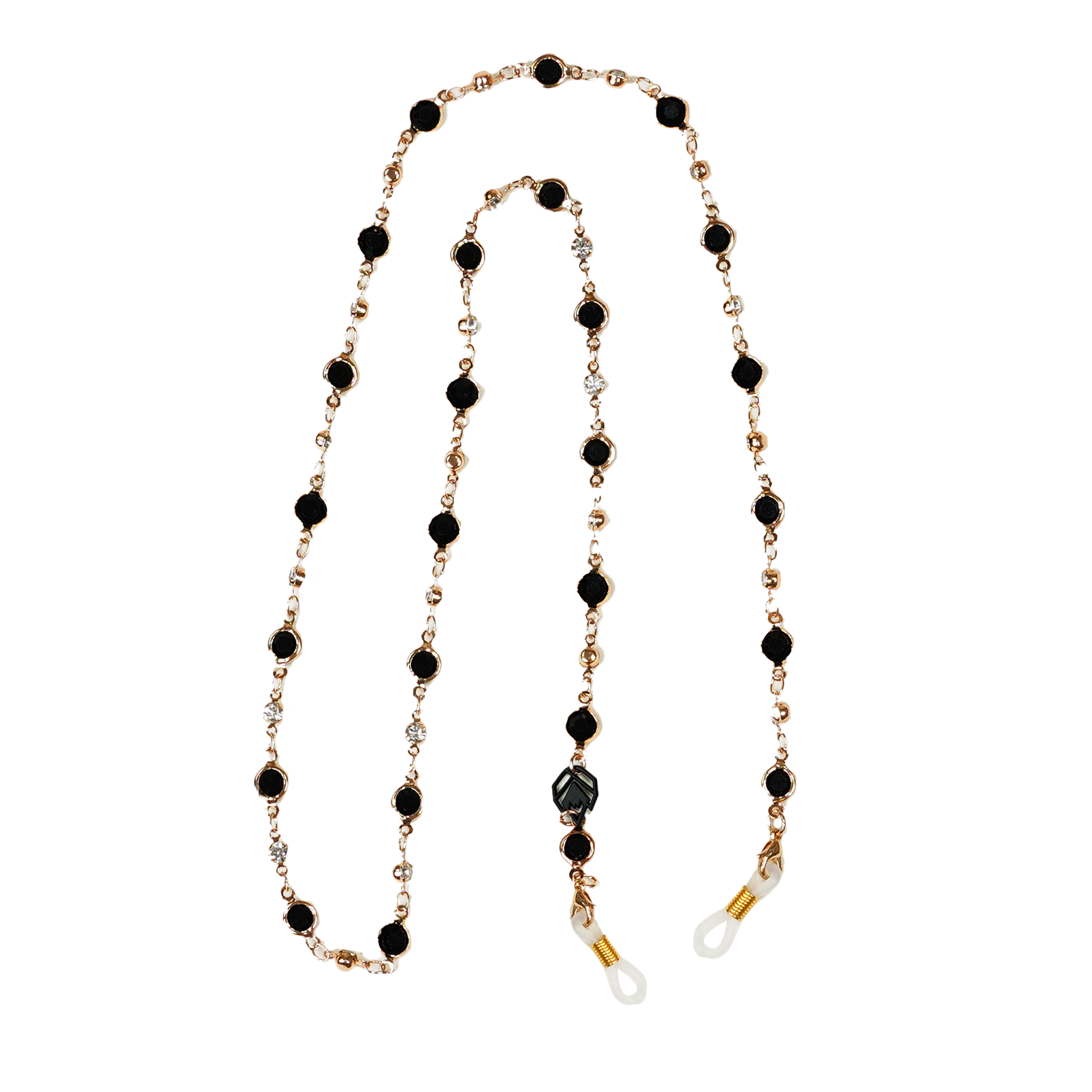 Diese Brillenkette in Gold mit Schwarz eingesetzten Steinen ist nicht nur praktisch sondern auch äußerst schick. Als angesagtes Mode-Accessoire passt sie auf jede herkömmliche Brille und lässt sich anhand der kleinen Feder am Ende des Bandes auf die unterschiedlichsten Brillenbügel anpassen. Das kleine Metall Logo als Anhänger vervollständigt diesen unverkennbaren modernen Style und macht sie zu einem absoluten Must-Have!